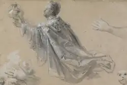 To prepare the work, Sequeira made a main preparatory study, in charcoal and white chalk, on the same scale as the final painting. Then, he made individual, detailed sketches of some of the figures, to hone postures, gestures, and facial expressions: there are more than twenty-five such sketches.[4] These are all part of the collections of the National Museum of Ancient Art; they were purchased for the Royal Academy of Fine Arts, an institutional ancestor of the museum, in 1878, following the death of the Marquis of Sousa Holstein.[7] José-Augusto França compares the skill Sequeira shows in these sketches as a draftsman to that of Tintoretto.[1]