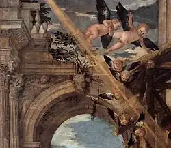 The grand architectural setting in a ruined classical temple is also typical of Veronese, who took a serious interest in architecture, although David Rosand suggests that the settings in his large paintings are better considered as stage scenery or temporary monumental decor for royal entries or other occasions (which was often very elaborate at this period) than compared in detail to actual architecture.[3] Nativity scenes are very often given such settings, which apart from showing off the artist's skill acted as a reminder of the medieval legend, reported in the popular compilation of the Golden Legend, that on the night of Christ's birth the Basilica of Maxentius in Rome, supposed to house a statue of Romulus, had partly tumbled to the ground, leaving the impressive ruins that survive today.[4]