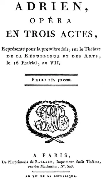 The opera was originally entitled Adrien, empereur de Rome and the premiere was scheduled for 13 March 1792. Hoffman had no political message in mind but the first act contained a scene in which the Emperor Hadrian celebrates a triumph. At the time, France felt under threat from Austria, whose Emperor Leopold II had just died. Rumours also spread that the horses to be used in the triumph were from the stables of Marie-Antoinette, the deeply unpopular French queen and Leopold's sister. Many Parisians began to express their displeasure at the forthcoming opera and on 12 March - in spite of the protests of the Opéra, which had invested large sums of money in the production - the political authorities intervened and banned the performance of Adrien to prevent a possible riot. A storm of controversy broke out in the Press as Hoffman refused to change his libretto, appealing to the law of 1791 which had freed French theatres from censorship as well as the Declaration of the Rights of Man and of the Citizen. Nevertheless, the premiere was replaced by a revival of Piccinni's Atys.[1]