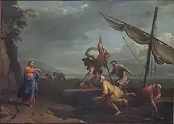 Manglard's most notable student in Rome was arguably Claude-Joseph Vernet, who hailed from Avignon.[31] Manglard, together with Bernardino Fergioni, initiated him into seascape painting. According to some authors, both Vernet and Manglard eclipsed their master, Fergioni. According to the same authors, Vernet had in turn a more "subtle grace and spirit" than his master, who presented a sound, firm, natural and harmonizing taste ("... Il suo nome [Bernardino Fergioni's] fu dopo non molti anni oscurato da due franzesi, Adriano Manglard, di un gusto sodo, naturale, accordato; e il suo allievo, Giuseppe Vernet, di una vaghezza e di uno spirito superiore al maestro").[32]