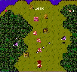 Adventures of Dino Riki is a scrolling shooter where the player takes on the role of the titular, primitive human Dino Riki in a prehistoric setting with dinosaurs. Each stage scrolls vertically with the objective being to avoid enemies and their projectiles then to defeat the boss at its end. Dino Riki can move in all directions, jump, and throw weapons to destroy enemies and uncover health and power-ups from boulders strewn about the landscape. These power-ups include speed boosts, wings that enable flight, and enhanced weapons. The player begins with rocks which can be upgraded to stone axes, then boomerangs, and finally torches, each consecutively improving range and spread of attack. A hidden item tile will transform the player into Macho Riki who can fire powerful projections of himself.[3]
