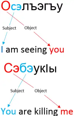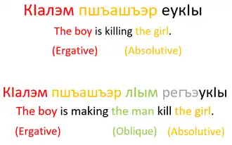 кӏалэр пшъашъэм еплъа е кӏалэм пшъашъэр къеплъа? кӏалэ-р пшъашъэ-м еплъ-а е кӏалэ-м пшъашъэ-р къ-еплъ-а? [t͡ʃʼaːɮar pʂaːʂam japɬaː ja t͡ʃʼaːɮam pʂaːʂar qajpɬaː] boy (abs.) girl (erg.) is (s)he looking at it? or boy (erg.) girl (abs.) is (s)he looking at it? "Is the boy looking at the girl or is the girl looking at the boy?"