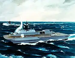 Preliminary design postulated that the ASEV would be based on the Small Waterplane Area Twin Hull (SWATH) configuration used by Hibiki-class ocean surveillance ships, with the combined main deck area sufficient to accommodate the Aegis radar deckhouse and battery of SM-6 interceptor missile launchers.[69] Such a SWATH-based configuration would be comparable to the 1986 CGH-67 design study (pictured) by the then David W. Taylor Naval Ship Research and Development Center of the U.S. Navy's Naval Sea Systems Command (NAVSEA) albeit without the explicit BMD orientation.[71]