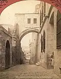 When later constructions narrowed the Via Dolorosa, the two arches on either side of the central arch became incorporated into a succession of more modern buildings. The Basilica of Ecce Homo now preserves the northern arch.[26][30] The southern arch was incorporated into a zawiya (Sufi monastery) for Uzbek dervishes of the Naqshbandi order in the 16th century,[31] but these were demolished in the 19th century in order to found a mosque.[32]