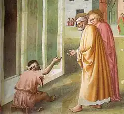 Aeneas (Greek: Αἰνέας, romanized: Aineas) is a character in the New Testament. According to Acts 9:32-33, he lived in Lydda, and had been a cripple for eight years. When Peter said to him, "Jesus Christ heals you. Get up and roll up your mat," he was healed and got up.