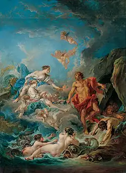 Because of her hatred of the Trojans, Juno (the Roman equivalent of the Greek Hera) pleads with Aeolus to destroy Aeneas' ships, promising to give Aeolus the nymph Deiopea as wife.[9] So Aeolus unleashed his winds against Aeneas.[10] But Neptune, angry at this usurpation of his sovereignty over the sea, commands the winds to: