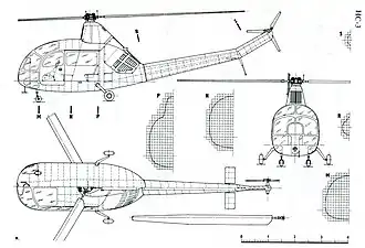 In early 1956, work began at the VZLÚ,[b] on a new three–four seat helicopter, based on the two-seat HC-2, which was intended for both civil and military use.[1][3][2] The resulting design, the HC-3, had a streamlined semi-monocoque fuselage and a low-mounted tailboom carrying the tail rotor. The three-bladed main rotor was of wooden construction, as was the tail rotor (also three bladed). The engine was mounted at the rear of the fuselage, behind a firewall, while the helicopter had a four-wheeled, non-retractable undercarriage, with the front two wheels castoring through 360 degrees.[1][5] The helicopter had seats for 4 or 5 people,[5][6] with dual controls being provided for pilot and co-pilot.[1] The interior could be quickly reconfigured to carry two stretcher patients and a medical attendant.[1]