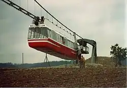 Aerobus is a self-propelled electrically powered bus-like vehicle riding on a suspended overhead cable. The cable arrangement, similar to a suspension bridge, allows for long spans of up to 600 metres between pylons. The Aerobus system was invented in the late 1960s by Gerhard Mueller of the GMD Mueller aerial lift company in Switzerland.[1] The patents to Aerobus are currently owned by Aerobus International Ltd. of Houston, Texas, United States.[2][3]