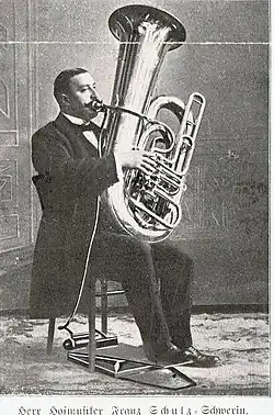 Some composers took advantage of the new invention, writing music that specifically requested the use of an aerophor in performance. Notable examples include Richard Strauss's An Alpine Symphony and Festival Prelude.[1][2] However, the use case of the device was limited, and the use of circular breathing technique could allow a musician to accomplish the same goal of playing indefinitely without the need for a special apparatus. Boston Symphony tuba player Paul Mattersteig made use of the device for some time, including that orchestra's December 1914 performance of Wagner's Faust Overture,[6][7] and Boston's first-chair horn Bruno Jaenicke and principal oboist Georges Longy "experimented with the device with much success."[8] Despite a generally positive reception by professional wind players at the time,[1] the aerophor never achieved widespread use, and today is regarded as nothing more than a curiosity.[2]