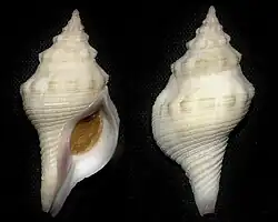 In this species the whorls are encircled with a series of nodules. The columella is smooth and callous, the siphonal canal strongly recurved, and the interior of the aperture is of a delicate violet colour.[2]