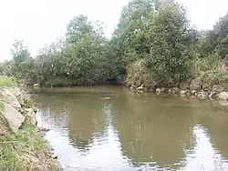 Leaving Rhiwsaeson, about a mile (1.5 km) east of Cross Inn, the Clun widens to between about eight feet (2.4 metres) and 12 feet (3.7 metres) and slows. Here, where the Clun flows to the south of Cross Inn, as well as along the banks of Nant Dowlais and Nant Myddlyn, evidence of otter activity has been noted.[6] The river flows to the south of the A473 Pontypridd to Bridgend (Penybont ar Ogwr) road (Talbot Green By-Pass), where it is fed from the south by Nant Mwyndy. Nant Mwyndy flows over a bedrock of Carboniferous Limestone, rising in Creigiau and, flowing westwards, immediately north of Groesfaen, passing a small industrial estate at Mwyndy, feeding a lake resulting from Victorian opencast iron mining (see History below) and turning south to flow past Cefn-y-Parc Cemetery, Penygawsi, before reaching its confluence with the Afon Clun.[7][8]