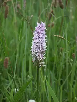 Among the species in the flood-meadows adjacent to the Afon Clun is the common orchid. The river's banks contain broadleaf woodland as well as invasive plants such as Himalayan balsam and Japanese knotweed.[9]