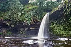 Sgwd Einion Gam, which is a further half mile, upstream can be accessed only by crossing and re-crossing the river itself. This fall is caused by the presence of a geological fault which brings another hard sandstone known as the 'Farewell Rock' up against softer mudstones.[3][4]