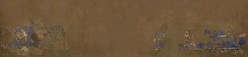 The four walls of the palatial room in Afrasiab seem to depict the four principal civilizations influencing in Central Asia at that time: Chinese, Indian, Iranian, and Turkic.[6] The Chinese chronicles of the Book of the Later Han appears to describe such mural depicting the four civilizations as a common feature in the region:[7]
