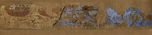 North wall "Chinese panel". Emperor Taizong is seen hunting, and the Chinese Empress is seen on a boat, on a visit to the Western Turk Khagan Shekui.[1]