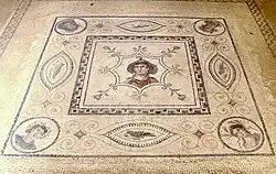 She is portrayed on some coins, carved stones, and mosaics in Roman Africa. A mosaic representing Roman Africa is found in the El Djem museum of Tunisia.[4][20][21] A sanctuary found in Timgad (Thamugadi in Berber) in Algeria features goddess Africa's iconography.[22] In Timgad, she was the main goddess of the great sanctuary of the Aqua Septimiana Felix, where she was worshipped as Dea Patria (goddess of the homeland).[23]