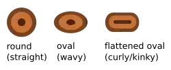 African-American hair comes in a range of textures, but the most common hair type is curly with lots of volume.[5] This curly quality is the product of the shape of the hair follicles.[5] More circular-shaped follicles cause hair to grow straighter, while more curly hair is caused by more elongated, oval-shaped hair follicles.[5] Hair follicles can also affect the thickness of hair strands.[5] African hair is seen to be much thicker and more dense meaning that the hair follicles are larger.[5] Density represents the amount of hairs that grow from the head, with denser hair resulting from more hairs growing closer together from the scalp.[5] An individual with high-density hair creates a fuller appearance of curls.