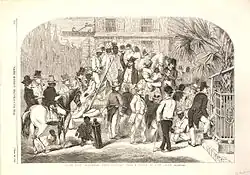 Slave auctions also served as a form of entertainment for many white residents in Charles Town. Even people that had no intentions of bidding on a slave watched as African men and women were sold by the auctioneer. In some instances, auctioneers provided wine, drink and other forms of refreshments for slave buyers. As the slave practice grew, the prices of slaves rose. By the 1770s, slaves sold as high as $1,500, or about the price of a new car in modern times, and families were often separated through the auction.[8]