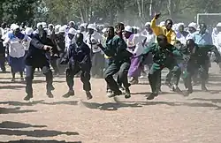 Zionism blends traditional Southern African beliefs with faith healing and water baptism. Some members wear white robes and carry staffs.[3]