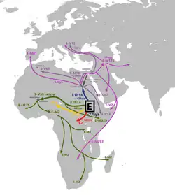 - ^ Trombetta B, et al. (June 2015). "Phylogeographic Refinement and Large Scale Genotyping of Human Y Chromosome Haplogroup E Provide New Insights into the Dispersal of Early Pastoralists in the African Continent". Genome Biology and Evolution. 7 (7): 1940–1950. doi:10.1093/gbe/evv118. ISSN 0016-6731. OCLC 8291848146. PMC 4524485. PMID 26108492.