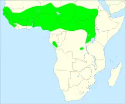 The African grey woodpecker is native to tropical parts of western and central Africa. Its range includes Angola, Benin, Burkina Faso, Burundi, Cameroon, Central African Republic, Chad, Congo, Democratic Republic of Congo, Equatorial Guinea, Eritrea, Ethiopia, Gabon, Gambia, Ghana, Guinea, Guinea-Bissau, Ivory Coast, Kenya, Liberia, Mali, Mauritania, Niger, Nigeria, Rwanda, Senegal, Sierra Leone, South Sudan, Sudan, Tanzania, Togo and Uganda.[1] Its typical habitat includes woodland, savannah with isolated trees, copses of larger trees, riverside forest and pasture.[3]