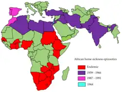 AHS virus was first recorded south of the Sahara Desert in the mid-1600s, with the introduction of horses to southern Africa. The virus is considered endemic to the equatorial, eastern, and southern regions of Africa. Several outbreaks have occurred in the Equidae throughout Africa and elsewhere.[1] AHS is known to be endemic in sub-Saharan Africa, and has spread to Morocco, the Middle East, India, and Pakistan. More recently, outbreaks have been reported in the Iberian Peninsula and Thailand. AHS has never been reported in the Americas, eastern Asia, or Australasia. Epidemiology is dependent on host-vector interaction, where cyclic disease outbreaks coincide with high numbers of competent vectors. The most important vector for AHS in endemic areas is the biting midge Culicoides imicola, which prefers warm, humid conditions. Larvae do not carry the virus, and long, cold winters are sufficient to break epidemics in nonendemic areas.