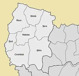 Afrin District (Arabic: منطقة عفرين, romanized: manṭiqat Afrīn, Kurdish: Herêma Efrînê) is a district of Aleppo Governorate in northern Syria. The administrative centre is the city of Afrin. At the 2004 census, the district had a population of 172,095.[1]