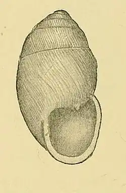 (Original description) The shell is rimate, oval, and somewhat thin with a whitish, polished surface. The nucleus and the front of the body whorl are almost smooth, while the remainder of the exterior features conspicuous, close-set, oblique striae. There are 6.5 convex whorls. The aperture is semi-ovate and erect, with a slightly expanded, white peristome. The parietal wall has a small tooth or callosity.