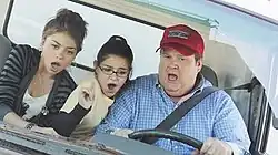 ![]() Cam (Eric Stonestreet) tries to drive a huge moving truck to prove Haley (Sarah Hyland) and Alex (Ariel Winter) that gay men can drive trucks | |