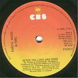 "After the Love Has Gone" is a song by Earth, Wind & Fire, released in 1979 as the second single from their ninth studio album I Am on ARC/Columbia Records.[1] The song reached No. 2 on both the US Billboard Hot 100 (behind the Knack's "My Sharona") and the Billboard Hot R&B Singles chart, No. 3 on the Billboard Adult Contemporary chart,[2][3][4] and No. 4 on the UK Singles Chart.[5] "After the Love Has Gone" was certified gold in the US by the RIAA and silver in the UK by the BPI.[6][7]
