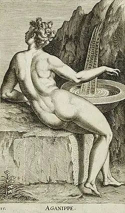 In Greek mythology, Aganippe (/æɡəˈnɪpi/; Ancient Greek: Ἀγανίππη means 'mare who kills mercifully'[1]) was the name of both a spring and the Naiad (a Crinaea) associated with it.[2] The spring is in Boeotia, near Thespiae, at the base of Mount Helicon,[3] and was associated with the Muses who were sometimes called Aganippides. Drinking from her well, it was considered to be a source of poetic inspiration. The nymph is called a daughter of the river-god Permessus (called Termessus by Pausanias).[4][5] Ovid associates Aganippe with Hippocrene.[6]