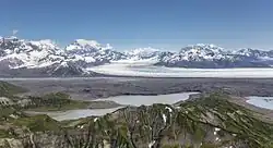 ![]() Malaspina Glacier is a compound glacier, formed by the merger of several valley glaciers, the most prominent of which seen here are Agassiz Glacier (left) and Seward Glacier (right). | |