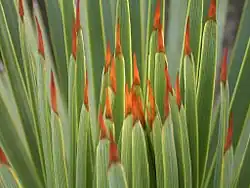 A. striata forms rosettes of hundreds of thin, narrow leaves, 60 cm (2 feet) long and 1.0 cm (0.4 inches) wide. The leaves stick straight out or arch gently upward toward the center of the plant, each ending in a very sharp, brown and black spine. The flower spike is up to 3 m (10 feet) tall and bears whitish yellow flowers 3.0-4.0 cm (1.2-1.6) inches in diameter. In the wild, numerous suckers result in thick clusters of plants growing to form impenetrable thickets.[5][6][7]