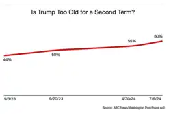 A July 2024 poll, taken shortly after the first presidential debate, found that 60% of voters saw Trump as too old for a second term.[12] This represented a steady and constant increase in voters polled by this pollster sharing this concern, and paralleled the progression of the larger number of voters who had the same concern about Biden.[12]
