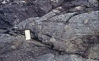Agglomerate (from the Latin agglomerare meaning "to form into a ball") is a coarse accumulation of large blocks of volcanic material that contains at least 75% bombs. Volcanic bombs differ from volcanic blocks in that their shape records fluidal surfaces: they may, for example, have ropy, cauliform, scoriaceous, folded, spindle, spatter, ribbon, ragged, or amoeboid shapes. Globular masses of lava may have been shot from the crater at a time when partly molten lava was exposed, and was frequently shattered by sudden outbursts of steam. These bombs were viscous at the moment of ejection and by rotation in the air acquired their shape. They are commonly 1 to 2 feet (30 to 60 cm) in diameter, but specimens as large as 12 feet (3.7 m) have been observed.[1] There is less variety in their composition at any one volcanic centre than in the case of the lithic blocks, and their composition indicates the type of magma being erupted.