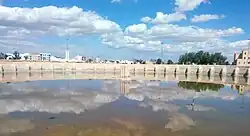 Kairouan, founded by the Arab-Muslim conquerors in 670, is located in the middle of an arid steppe.[5] Unlike most major towns of the era, it was not near a river or other abundant source of water, which meant that the provision of water was a perennial concern.[6] According to the 11th-century Andalusi geographer al-Bakri, the Umayyad caliph Hisham (r. 724–743) ordered the construction of 15 water reservoirs outside Kairouan, but these have not survived to the present day.[5] In the 9th century, when Kairouan was the center of the Aghlabid Emirate, which governed the region nominally on behalf of the Abbasid Caliphs, the Aghlabid ruler Abu Ibrahim Ahmad (r. 856–63) commissioned the construction of the two large reservoirs which are still visible today.[7][8][1] They were built between 860 and 862[9] and the construction was supervised by Khalaf al-Fata, an emancipated slave who served Abu Ibrahim Ahmad.[6] Many of the city's residents lived in houses that were supplied by their own private wells and cisterns, so the water from these reservoirs was used to supplement them in times of drought or to supply water to livestock and caravans.[9] Another Aghlabid water reservoir that has been preserved up to modern times was built to supply their new capital at Raqqada (founded in 876[10]), near Kairouan. It has a trapezoidal form, with the longest side measuring 182 metres long.[7]