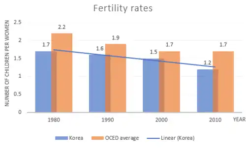 The South Korean fertility rate of 1.8 children per woman was below the OECD average fertility rate of 2 children per woman in 1984 and has remained below average since then.[9] In 2018, the total fertility rate in South Korea declined to 0.98.[10] In order to maintain a population of 50 million, the fertility rate would need to match the replacement level of 2.1.[10] Among OECD countries, Korea was the only country whose fertility rate declined below 1.[10]