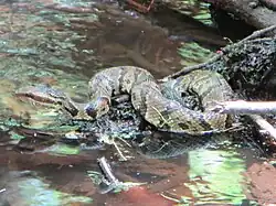 The eastern cottonmouth (Agkistrodon piscivorus piscivorus)[4][5] was once classified as a subspecies of the cottonmouth (Agkistrodon piscivorus). However, DNA based studies published in 2008 and 2015, revealed no significant genetic difference between the eastern cottonmouth (Agkistrodon piscivorus piscivorus) and the western cottonmouth (Agkistrodon piscivorus leucostoma) and synonymized the two subspecies (with the oldest published name, A. piscivorus, having priority). The resulting taxonomy does not recognizes the eastern cottonmouth (A. p. piscivorus) as a valid taxon.[7][8] Several subsequent reviews and species accounts have followed and supported the revised taxonomy.[9][10]: 437 p. [11] Information on this snake can be found in the Agkistrodon piscivorus article.