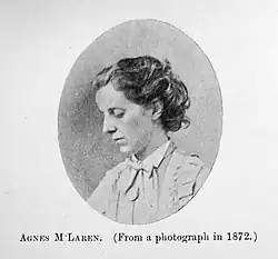 Agnes McLaren (4 July 1837 – 17 April 1913)[1] FRCPI was a Scottish doctor who was one of the first to give medical assistance to women in India who, because of custom, were unable to access medical help from male doctors. Agnes was active in social justice causes including protests against the white slave trade.[2] She signed the 1866 women's suffrage petition and was secretary of the Edinburgh National Society for Women's Suffrage alongside her stepmother, Priscilla Bright McLaren.[3] In 1873 she travelled with Priscilla and Jane Taylour to give suffrage lectures in Orkney and Shetland.[4] Her father had supported the campaign of first women who sought to study medicine at University of Edinburgh and Agnes became friends with Sophia Jex-Blake, one of the Edinburgh Seven. Her father did not however support Agnes' own ambitions in this area. And as she could not graduate in medicine in Scotland, she went to study in France and later, in order to be permitted to practice at home, became a member of the Royal College of Dublin.[4]
