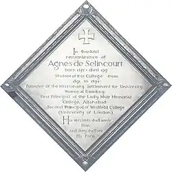 Agnes de Selincourt (1872–1917) was a Christian missionary in India, responsible for the founding of missions, becoming the first Principal of Lady Muir Memorial College, Allahabad, India and then Principal of Westfield College, London, UK from 1913 until her death in 1917.[1][2][3][4]