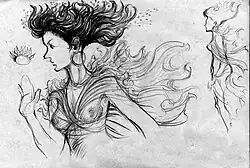 "Rupen apa ha samawana minisa " (Behold the Man whose frame, face and appearance are similar to us the gods)- Ginipathi (Prometheus)- Dressed in white in the kingdom of gods, sings with a deep love for the mankind.