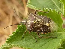 They have five nymphal stages, and are 8 to 12 mm long as adults. They attack (or control) weeds and herbs including horehound, thyme, flax and cotton, or the developing seeds of sunflowers or cereals like millet or sorghum.[3] They may swarm on a variety of other shrubs and trees, including coffee and cacao.[2] The scent gland is located at the end of the abdomen.