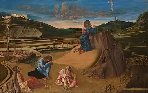 Bellini's painting situates the viewer at a great crossroads in the life of Jesus. The painting cannot visually represent Jesus's words "Let this cup pass from me", nor his insistence to his disciples to stay awake with him, nor his final acceptance of his fate. Yet Bellini captures the great gravity of the situation.[6]