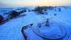 The old Danish word, bavn, in Bavnehøj, means stack of wood or fire placed on high ground.[1] The bronze age people and their ancestors used Agri Bavnehøj and other hilltop barrows as part of a warning system, where one lit fires on hilltops to warn neighbour communities of dangers, such as invasions.[1] The neighbours in return lit fires on their own designated hilltops, creating a telegraph chain of fires, spreading the word of unrest.[1] This function was maintained all the way up to the 1800s - actually as late as in the Three Year War (Treårskrigen) 1848 -50,[1] that amongst other things saw the withdrawal of the Danish general Olaf Rye’s army past Århus over southern Djursland to the peninsula Helgenæs that he fortified at the narrow Dragsmur passage 8 kilometers[2] from Agri Bavnehøj. From Helgenæs Rye succeeded in shipping the army to Fredericia in the southern part of Jutland in Denmark, where the army was able to continue fighting, after having manoeuvred around the German front by sailing round it.[1]