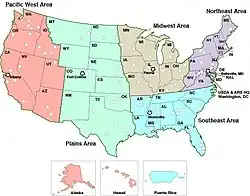 ARS supports more than 2,000 scientists and post docs working on approximately 690 research projects within 15 National Programs at more than 90 research locations.[3] The ARS is divided into 5 geographic areas: Midwest Area, Northeast Area, Pacific West Area, Plains Area, and Southeast Area.[12] ARS has five major regional research centers: