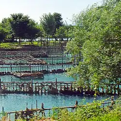 Mussels are widespread throughout the south of the country and particularly cultivated in Lake Butrint along the proximity to the Ionian Sea.[15] In 1980, almost 80 mussel cultivation facilities were constructed with an average production of about 2,000 tonnes per year, while in 1989 it increased to 5,000 tonnes per year.[15][16] Although in Shëngjin operates as well a smaller facility of about 100 hectares. Following the end of communism and outbreak of cholera in 1990, the production declined sharply and opened again in 2000.[15][17][13]