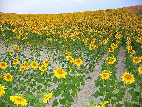 As a further step in reducing Spanish dependence on imported soybeans, the government encouraged sunflower production.[2] Especially favorable growing conditions, coupled with generous government support, caused sunflower seed output to expand spectacularly, and the amount of land used for its cultivation went from virtually nothing in 1960 to approximately 1 million hectares in the 1980s.[2] Sunflower-seed meal was not the most desirable livestock feed, and therefore was not used in this way, but by the 1980s most Spanish households used the cooking oil it provided because it was less expensive than olive oil.[2]