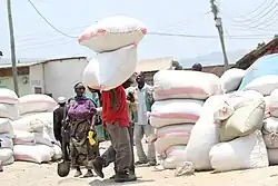 The cash crop is usually cultivated in the southern coastal regions of the country, near the towns of Mtwara, Kilwa and Dar es Salaam. The sale and marketing of the product is run by the Cashewnut Board of Tanzania, through various farmer co-operatives.[21] More than ninety percent of the exports are destined for India and almost entirely in raw form. The lack of domestic processing firms costs the country vital foreign revenues and thousands of jobs. The Tanzanian government has been facing challenges for finding potential investors in order to revive the cashew processing industry in Tanzania.[22]Food Crops