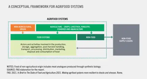 In 2021, FAO released the first definition of agrifood systems and agrifood systems’ resilience in The State of Food and Agriculture 2021 – Making agrifood systems more resilient to shocks and stresses. The definition of agrifood systems' resilience is adapted from Tendall et al.'s definition of food system resilience, which is “capacity over time of a food system and its units at multiple levels, to provide sufficient, appropriate and accessible food to all, in the face of various and even unforeseen disturbances”.[28][1][2] Agrifood systems are broader than food systems, as these encompass the entire range of actors and their interlinked value-adding activities in the primary production of food and non-food agricultural products, as well as in food storage, aggregation, post-harvest handling, transportation, processing, distribution, marketing, disposal and consumption.[1][2]