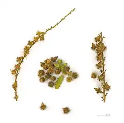 The flowers with their abundant pollen supply attract hoverflies, flies and honey bees. They also are an important food source for butterflies like the grizzled skipper.[8] The pollinated flowers develop fruits with burs. These attach to passing grazing animals, such as cattle, sheep and deer, and are dispersed over a large area.[2]